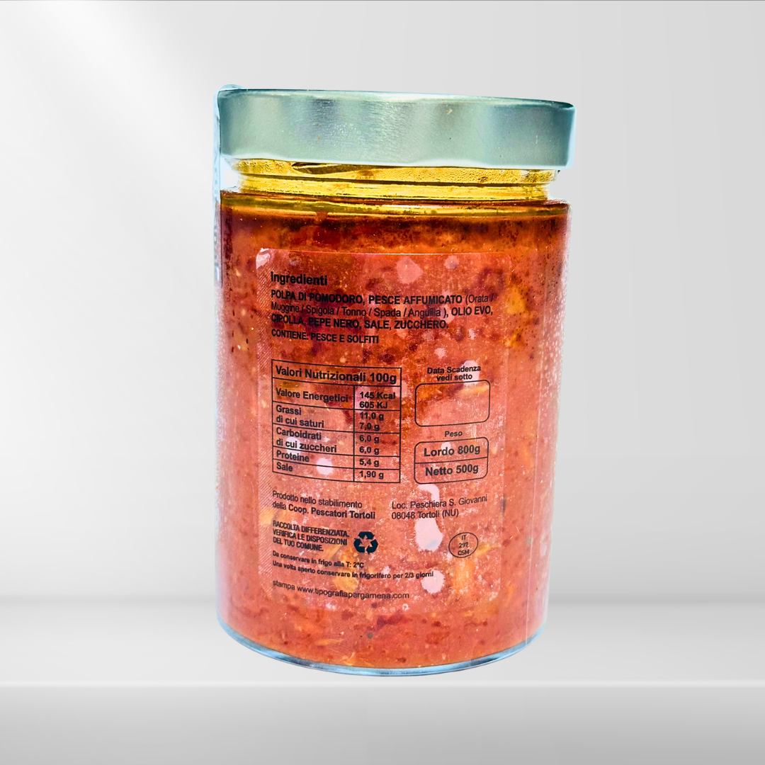 Il Sugo Amatriciana di Mare “I Pronti” nasce a Tortolì, dove il profumo di pesce affumicato si unisce alla dolcezza del pomodoro e all’aroma dell’olio EVO.